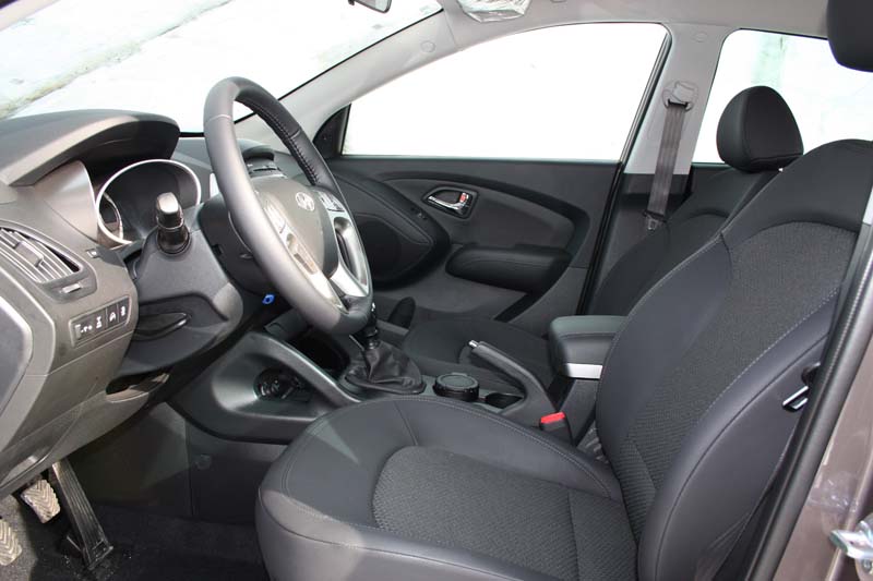 Sve ono pozitivno za prednju, važi i za zadnju sekciju, gdje dominira upadljiva svjetlosna grupa i krovni spojler sa integrisanim trećim stop svjetlom. Što se tiče dimenzija Hyundai iX35 u dužinu mjeri 4410 mm, a prvi utisak da je veći nego što to u stvari i jeste, objašnjavamo priličnom širinom vozila od 1.830 mm, odnosno od 2.100 mm, mjereno sa vanjskim retrovizorima. Samo jedan od razloga zašto je Hyundai prošle godine proglašen za najkvalitetniju marku u Njemačkoj, najbolje se ogleda u enterijeru našeg testnog SUV-a iX35. Prije svega, u oči najprije upada veoma zanimljiv dizajn enterijera sa potpunom instrument tablom izrađenom od kombinacije tvrde i mekane plastike tamnih tonova, oplemenjene brojnim insertima u boji aluminijuma. Upravo ovi detalji unutrašnjosti modela iX35 daju i određenu notu prestiža, za šta su svakako zaslužna i udobna sjedišta presvučena kombinacijom kože i platna. Pedantna završna obrada zaslužuje visoke ocjene, upravo kao i ponuda prostora, koja će zadovoljiti i natprosječno visoke osobe.