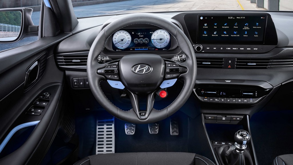 Unutrašnjost kabine je uglavnom identična u odnosu na standardni i20, ali tu je par sportskih sjedišta, aluminijumske papučice komandi i sportski upravljač. Centralni displej od 10,20 inča osjetljiv na dodir omogućava pristup svim funkcijama automobila i adaptivnim načinima vožnje, zajedno sa podrškom za Apple CarPlay i Android Auto aplikacije.