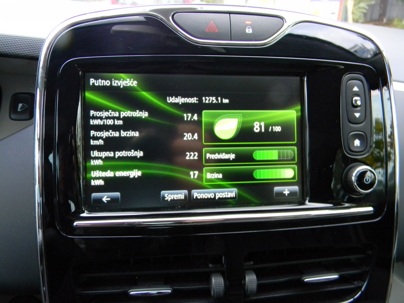 Na centralnom displeju možete naći sve moguće podatke o protoku energije i potrošnji. Mi smo test završili sa prosječnih 17,4 kWh, s tim da „podvlačimo“ kako se nismo nimalo trudili vještački produžavati autonomiju. Po nekakvim prosječnim cijenama električne energije vožnja na dionici od 100 km košta tek nešto više od 2 KM, dok potpuno punjenje seta baterija traži 4,5 KM. Sve na prvi pogled izgleda ružičasto, ali nije. U cijenu automobila nije uračunat set baterija. Njega, kao i većina proizvođača EV automobila, Renault iznajmljuje po cijenama koje određuje prosječna godišnja kilometraža. Vozači koji tokom 12 mjeseci prelaze do 7.500 km svaki mjesec moraju izdvajati oko 110 KM, što je otprilike ista suma koja se odvaja za fosilna goriva. Nadalje, kupovina i registracija u BiH je skoro pa nemoguća, što zbog neuređenosti naših propisa što zbog uslova koje postavlja proizvođač. Treba dodati da punjenje preko obične kućne utičnice traje između osam i 10 sati. Kada smo bili konektovani na brzi punjač za sat vremena obnovili smo oko 60% kapaciteta, što je prilično dobro. Da nije tako kako jeste sigurni smo da bi i na našim cestama bilo više ovakvih vozila, tim prije jer je osjećaj u vožnji stvarno dobar...