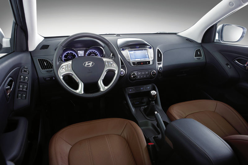 Napredak u dizajnu unutrašnjosti je očigledan, a klasične krute forme kakve je nudio Tucson sada su zamijenjene mekanim, zaobljenim linijama, koje su u skladu sa aktuelnim modnim trendovima. S druge strane veliki napredak ostvaren je na polju ergonomije, ali i ukupnog kvaliteta ugrađenih materijala i njihove završne obrade, da bi se korejski SUV lakše suprotstavio etabliranoj evropskoj konkurenciji. Dominantnu ulogu u unutrašnjosti zauzima centralni stub, sa fabričkim integracijama CD/MP3 muzičkog sistema ili navigacije. Broj komandi je minimaliziran, a njihov položaj je ergonomski doveden na najviši nivo. Jedini detalj koji vizuelno narušava sklad prostor oko središnjeg grebena je potenciometar za podešavanje intenziteta svjetala, smješten na površinu sa desne strane upravljača. Instrument tabla nudi novu kombinaciju plavo-bijelog osvjetljenja, koje mijenja dosadašnje napadno plavo.