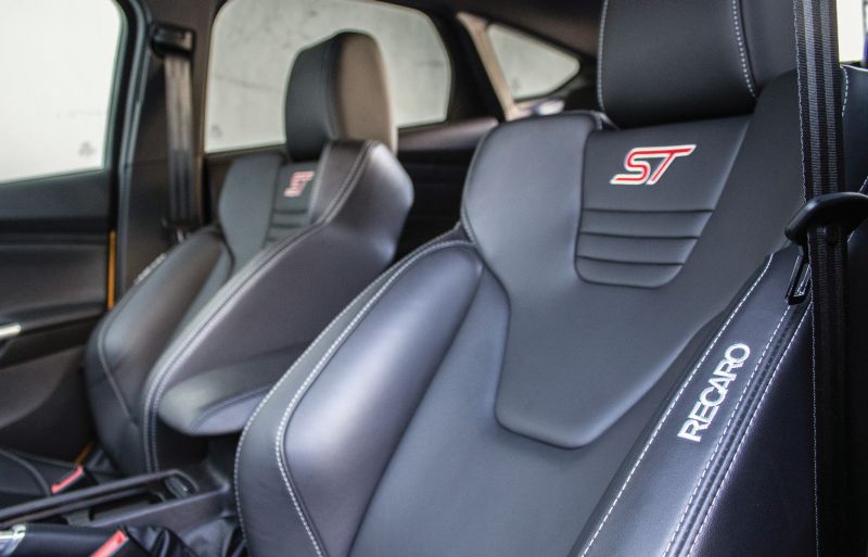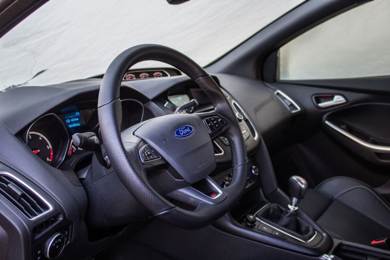 Činjenicu da je na tržištu već pet godina Focus najteže skriva u enterijeru. Monohromatski displeji sa zelenim pismom odavno su stvar prošlosti u većini evropskih modela. Ni jednostavna grafička podloga analognih instrumenata ne djeluje više tako moderno, a mnogi konkurenti u sportskim modelima poput testnog serijski nude savremenije multimedijalne uređaje od Fordovog Radio CD/MP3 sistema, sa 3,5 inčnim dvorednim displejom, šest zvučnika i daljinskim komandama na upravljaču. No ništa od navedenog nije nam zasmetalo u testnom modelu. Štaviše, takvo uređenje nam se učinilo idealnim za njega, jer nam je omogućilo da na pravi i pomalo zaboravljeni način sagledamo ST kao sportski automobil, a ne kao „tablet na točkovima“. U tom nastojanju su nam svesrdno pomogli mesnati trokraki upravljač čiji oblik, preciznost i osjećajnost treba iskreno pohvaliti. U ugodnom sjećanju nam je ostala i ručica veoma preciznog šestostepenog mjenjača, koji s lakoćom klizi kroz sve brzine. Pohvale zaslužuju i dolična Recarova sjedišta koja odlično drže tijelo u zahtjevnoj i dinamičnoj vožnji. S druge strane su i veoma udobna i ugodna za svaki dan.